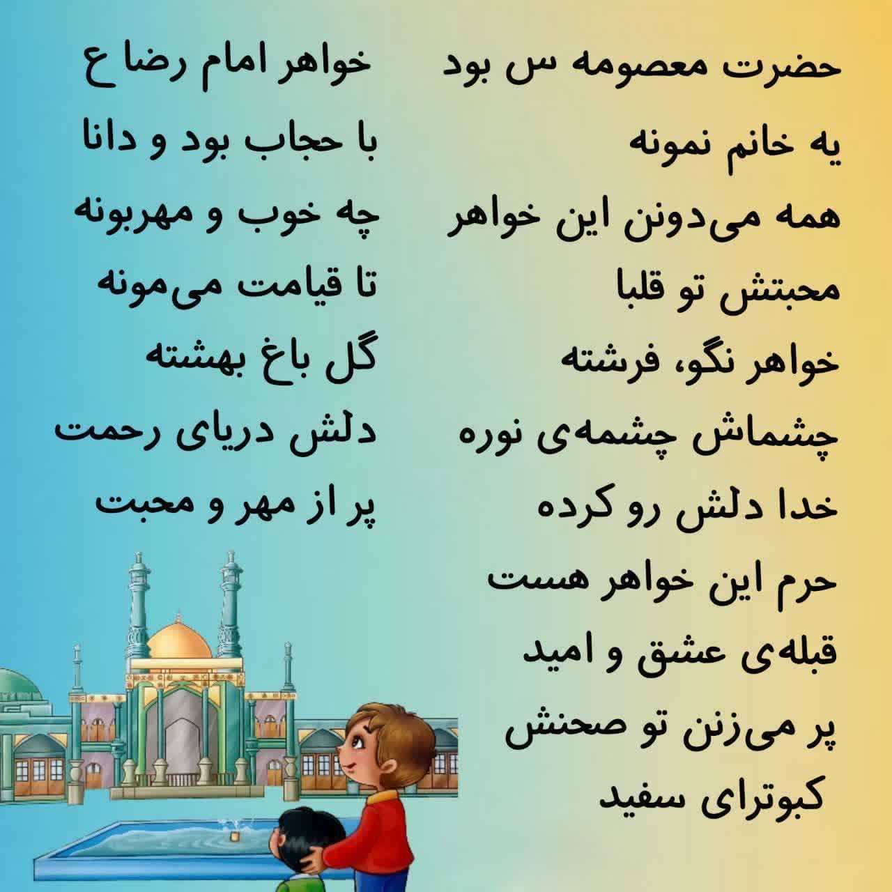 سرزمینم در میانش رد پای نور دارد در شمالش شهر مشهد در دل آن گنبدی زیبا ، نمایان آستان هشتمین خورشید رخشان امامت ماه تابان هدایت نام زیبایش رضا(ع) آرام دلها روشنی بخش دل ما گنبد زرد و طلایش نور چشم زائران است آشیان عاشقان است مثل خورشید درخشان میدرخشد در میان کشور زیبای ایران